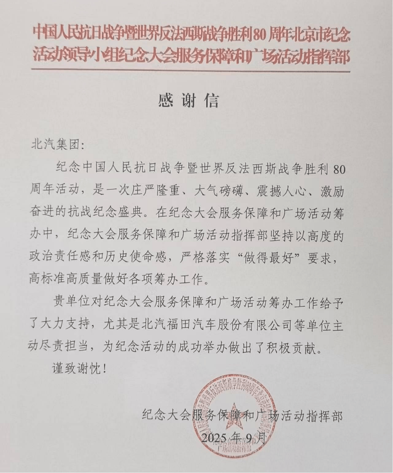 近日,北汽集团收到来自中国人民抗日战争暨世界反法西斯战争胜利80周年北京市纪念活动领导小组纪念大会服务保障和广场活动指挥部(简称“纪念大会服务保障和广场活动指挥部”)的感谢信,对北汽福田等单位在相关服务保障工作中所展现的高标准、高质量表现予以充分肯定。
