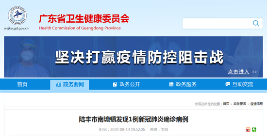 据广东省卫健委8月14日通报,汕尾陆丰市在医疗机构发热门诊监测中,排查发现1名新冠肺炎核酸阳性人员,经广东省市卫生健康部门判定,为新冠肺炎确诊病例。