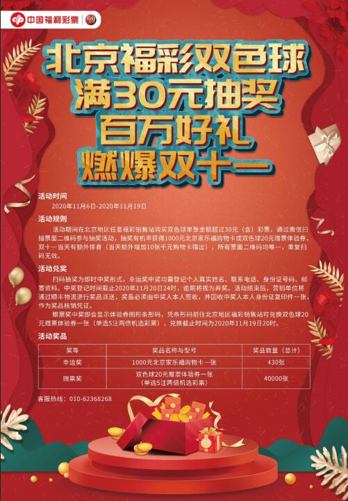 活动期间在北京地区任意福彩销售站购买双色球单张金额超过30元(含)彩票,通过微信扫描票面二维码参与抽奖活动,有机会获得幸运奖1000元北京家乐福购物卡(活动期间每天赠出30张)或赠票奖双色球20元赠票体验券,双十一当天有额外惊喜(当天加赠10张千元北京家乐福购物卡),所有票面二维码均唯一,重复扫码无效。