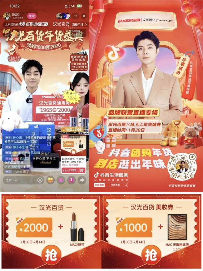 营销玩法不设限,创新更是流量密码。北京核心商圈汉光百货以“年货盛典”为主题,与平台深度合作,打造北方重点城市中首个“国际美妆+综合商场+明星达人”的联营直播模式,整合多方优质资源。汉光联合M.A.C等国际美妆品牌推出专属年味货盘及福袋,贴合北方消费者新春置妆礼赠需求,邀请明星袁成杰打造沉浸式直播。从12月通过西城消费券激活商家,到1月建立平台信任后加大运营投入力度,扫码价值带动三天核销突破700万,后续借品牌、艺人资源撬动直播大场,单场支付超百万,实现声量与销量双突破。